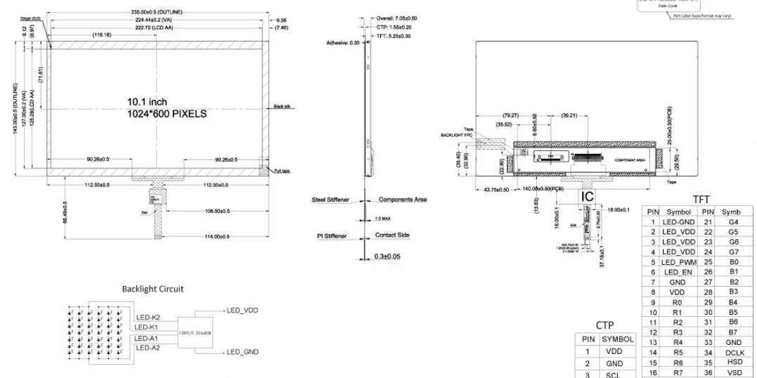 235 mm × 143 mm × 7,05 mm baino ez dituen dimentsio finak gailu trinkoetarako egokia da. 3.3V-rekin elikatzen da eta 40 pin FFC kable bat erabiliz (6 pin FFC CTPrako), 10,1 hazbeteko PCAP ukipen-pantaila industrialaren moduluak -20°C eta 70°C bitarteko tenperaturetan funtzionatzen du eta -30°C eta 80°C arteko biltegiratze tenperatura-tartea du, ingurune gogorretan ere funtzionamendu fidagarria bermatuz.