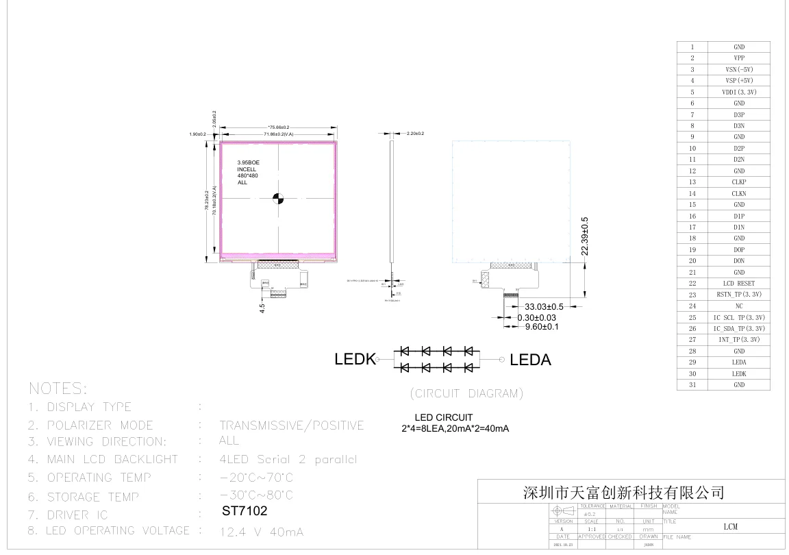 Etxe adimendunerako 3,95 hazbeteko tamaina txikiko IPS zelula barruko ukipen-pantailako moduluak System MIPI/IIC interfaze bikoitzak eta ST7102I kontrolatzaile IC (30 ms-ko erantzun-denbora azkarra) onartzen ditu. 4S2P LED atzeko argiak (40mA korronte baxua) distira eta energia eraginkortasuna orekatzen ditu. 2,2 mm-ko modulu meheak instalazio trinkoa errazten du.